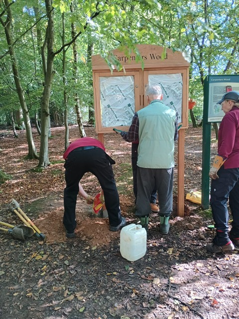 We had a great turnout for installing the replacement interpretation boards and doing path maintenance. Countryside Management Service (CMS) provided the boards and we worked with their volunteers to install them at the Farm Gate and Whitelands Avenue entrances. We also removed a large tree which had fallen across the path and cut back brambles, nettles, and overhanging tree branches.